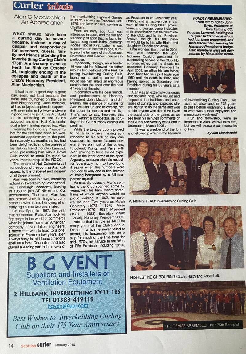 The article below was written by Jim Macdonald and was printed in the Your Curler magazine in January 2010. Alan was without doubt one of the most significant members in the club's history. The article highlights his contribution to the club. He retired as secretary after two spells totalling over 20 years and was made Honorary President in the club's 175th anniversary year. Sadly he died at the bonspiel and dinner to celebrate this anniversary. As Jim says in his article - 'we will miss him, but we will treasure our memories of him'. The club is stronger for Alan being a member.